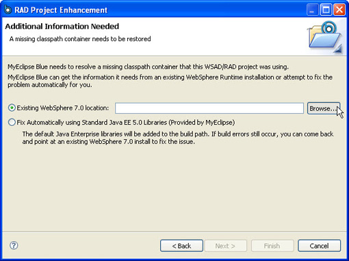 | MyEclipse Blue Edition can work seamlessly with your existing WebSphere installations and RAD projects...really! Here's how you can quickly get started by installing MyEclipse Blue
