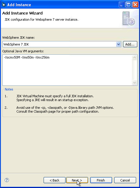 Hit the servers tab near the bottom of the workbench and right Note: MyEclipse comes bundled with Derby and Tomcat, but we Our server preferences page will pop up to allow you to easily You'll then be asked to browse to your existing installation of Once you have the directory selected, click on the "Add" button to Once you click "Add," the "Add Instance" wizard will appear, In my case, the profile is called "AppSrv01." Hit "OK." You'll see that the wizard has just populated the many required We'll also have some arguments automatically applied for us. Again, Finally, hit "Finish," again with no changes. If you don't know about Hit "Apply," then "OK." WebSphere 7 will now appear in the Server tab we were in before, If you're familiar with WebSphere, you likely have experienced the